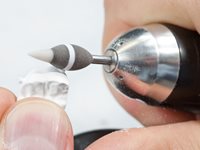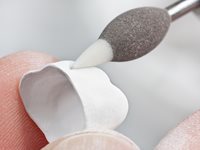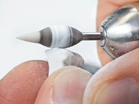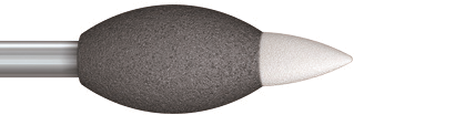 Weißlingspolierer ZrO2 2-stufiger Polierer für ZrO2 Weißlinge Der neue „2 in 1“ Polierer ermöglicht durch sein 2-Zonen-Arbeitsteil und seine spezielle Formgebung die Bearbeitung von ZrO2 Weißlingen. Die graue Zone des Polierers verfügt über ein grobes Poliermedium. Sie reduziert schnell und kontrolliert die Haltestege. Mit der weißen Arbeitsteilspitze, der 2. und feinen Zone, können beispielsweise okklusale und interdentale Bereiche oder Kronenränder nachgearbeitet werden. Die materialschonende Bearbeitung kommt den ZrO2 Weißlingen zu Gute. Das Risiko einer Beschädigung des kreideartigen Rohlings wird dadurch deutlich minimiert.