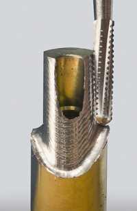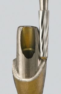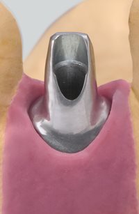 Turbine Zur zügigen Bearbeitung von Titan-Abutments Komet hat in Zusammenarbeit mit ZTM Jan-Holger Bellmann den neuen Fräser für die Laborturbine entwickelt. Mit ihm wird das schnelle Ausarbeiten von großvolumigen Abutments aus Titan zum Kinderspiel und alle Arten vorkonfektionierter oder gegossener Abutments können zügig individualisiert und anatomisch korrigiert werden. Mit der Turbine und geeigneten Fräsern kann mit deutlich höherer Drehzahl gearbeitet werden als mit regulären Fräsern im Fräsgerät oder Handstück. Der Materialabtrag ist entsprechend höher und schneller.