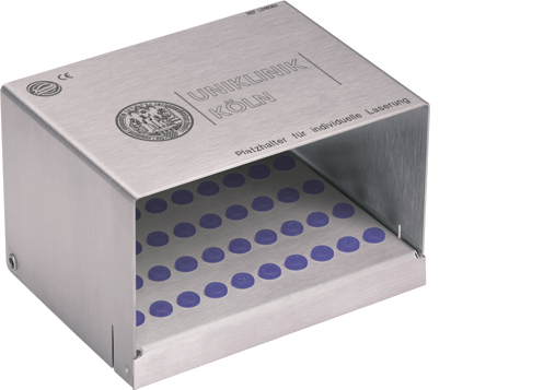 Instrumentenständer Zur Aufbereitung von FG- und Winkelstückinstrumenten Instrumentenständer aus rostfreiem Edelstahl mit 40 Aufnahmen für FG- und Winkelstückinstrumente, mit vormontierten blauen Silikonstopfen, für eine max. Instrumentenlänge von 58 mm.