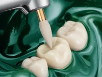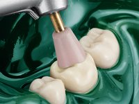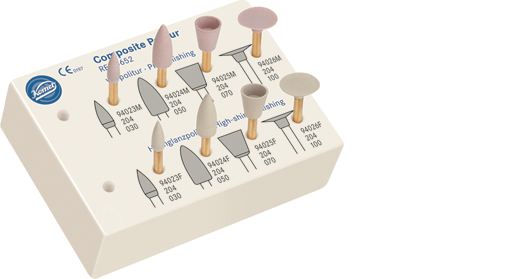 Mit diesem System bietet Komet den optimalen Mix aus Standzeit und Flexibilität. Nach vorheriger Formgebung durch Hartmetallfinierer oder Rotringdiamant erfolgt mit den hellrosafarbenen Polierern in der ersten Stufe die Vorpolitur. Die eingesetzte Diamantkörnung ermöglicht Formkorrekturen und eine optimale Vorpolitur von Oberflächen. Anschließend erzielen Sie mit der zweiten Polierstufe (hellgelb) einen perfekten Hochglanz. Hier führt das Zusammenspiel der speziellen Bindung und feinen Diamantkörnung zu überzeugendem Hochglanz bei gleichzeitig hoher Standzeit.