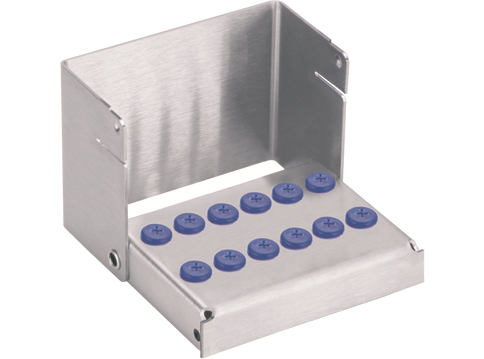 Instrumentenständer Zur Aufbereitung von FG- und Winkelstückinstrumenten Instrumentenständer aus rostfreiem Edelstahl mit 12 Aufnahmen für FG- und Winkelstückinstrumente, mit vormontierten blauen Silikonstopfen, für eine max. Instrumentenlänge von 28 mm.