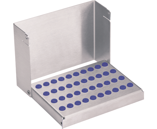 Instrumentenständer aus rostfreiem Edelstahl mit 40 Aufnahmen für FG- und Winkelstückinstrumente, mit vormontierten blauen Silikonstopfen, für eine max. Instrumentenlänge von 33 mm.