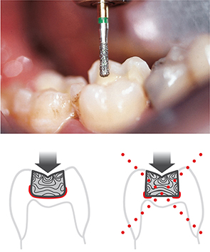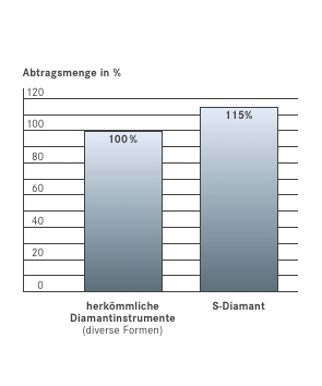 Das Eröffnen einer Kavität und die Vorpräparation werden mit Hilfe der strukturierten Diamantinstrumente vereinfacht. In Verbindung mit grobem Korn gelingt ein ausgeprägt schneller und effektiver Materialabtrag bei verbesserter Kühlung. Die Mehrkantstruktur des Rohlings reduziert das Verschmieren und senkt die Hitzeentwicklung. Der Arbeitsablauf wird deutlich effektiver. Vergleicht man gängige Diamantinstrumente mit den S-Diamanten, so ist die höhere Abtragsleistung der strukturierten Instrumente deutlich messbar.